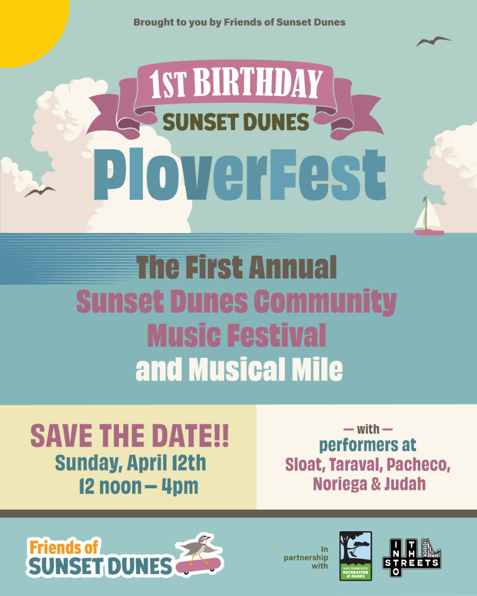 Enjoy a “musical mile” of local bands and DJs playing along the park, plus games and family-friendly activities throughout the afternoon. Sunday, April 12, 12-4pm Sunset Dunes from Sloat to Judah